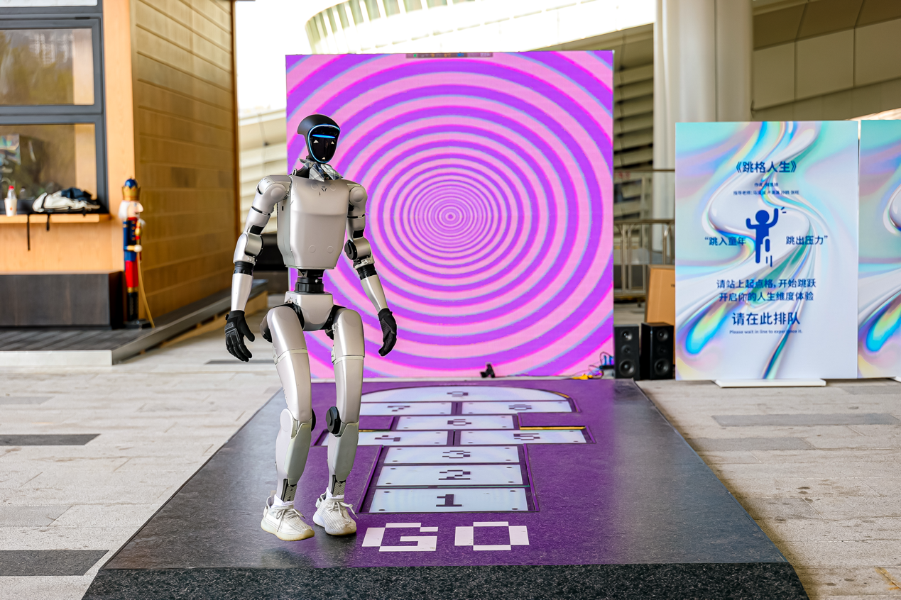 另一件備受關(guān)注的新質(zhì)影像代表作品是由香港數(shù)字藝術(shù)家周也山創(chuàng)作的裝置作品《灣區(qū)之眼》。作品以“天圓地方的當(dāng)代凝視”為核心概念,結(jié)合裸眼3D與AI光影技術(shù),在投影中交織傳統(tǒng)紋樣與灣區(qū)數(shù)字肌理。通過動態(tài)光影的變化,以“方靜圓動”詮釋文化根基與創(chuàng)新精神的融合。深圳青年藝術(shù)家何思琦的互動作品《跳格人生》以“跳房子”為靈感,引導(dǎo)觀眾通過身體參與喚醒記憶與情感,讓藝術(shù)真正走進城市生活。