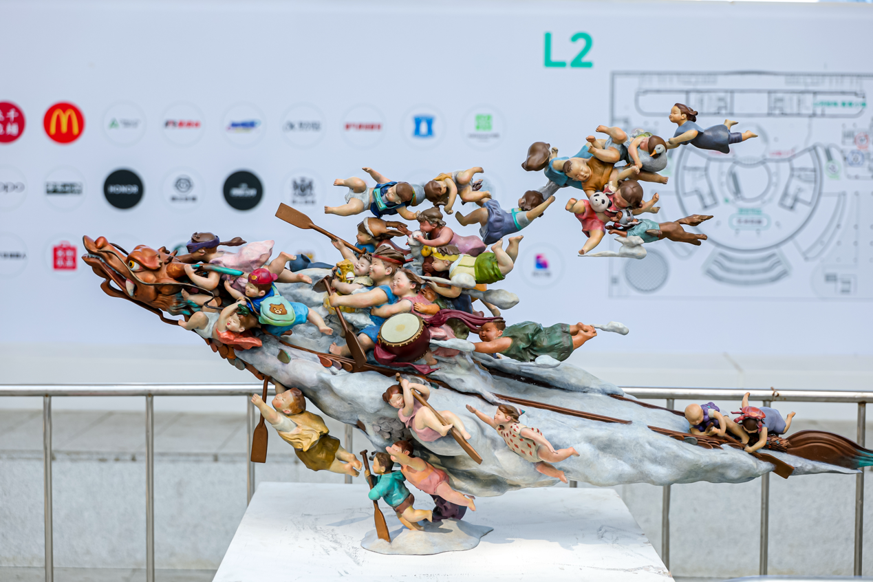 除新質(zhì)影像作品,展覽現(xiàn)場還融合了其它公共藝術(shù)裝置、多媒體燈箱等多形式藝術(shù)創(chuàng)作,進一步激活了展覽場域的空間聯(lián)結(jié),深化公眾參與體驗。深圳藝術(shù)家鄭躍飛創(chuàng)作的公共裝置《星之塔》,采用可持續(xù)環(huán)保板材與創(chuàng)新榫卯結(jié)構(gòu)搭建而成,裝置層層向上延展,在空間中構(gòu)筑出星穹般的浪漫意象,生動呼應(yīng)“青年匯聚·創(chuàng)造無界”的展覽主題。藝術(shù)家沈夢瑤的《踏夢神舟》借嶺南龍舟文化,以超現(xiàn)實手法,展現(xiàn)團隊協(xié)作等龍舟精神,承載青年憧憬,追求“超越無界、奔赴未來”的意境。